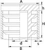 | Сторона квадрата A, мм | Сторона квадрата B, мм | Внутреннее сечение d, мм | Подходящая толщина трубы s, мм | Рабочая высота H, мм | Высота шляпки h, мм |